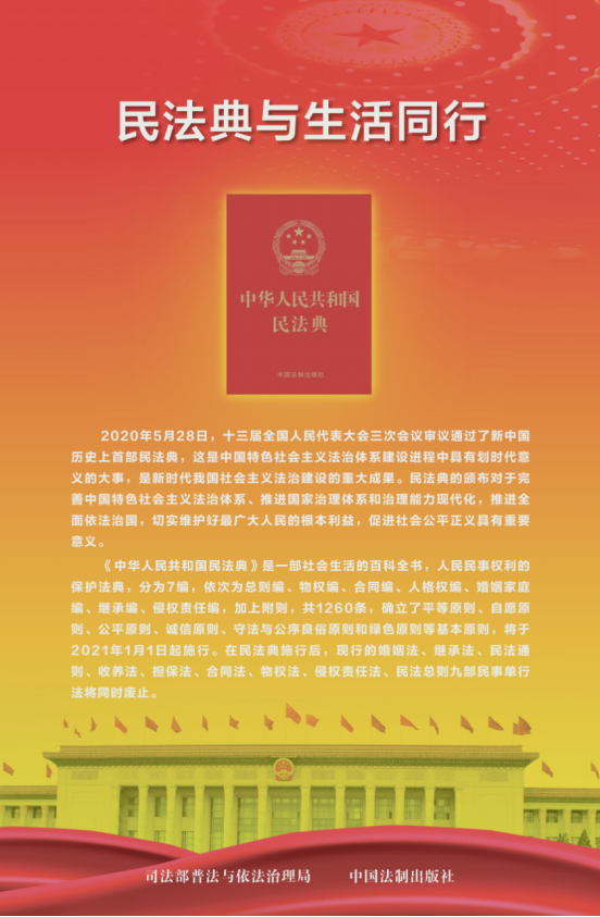 2020年5月28日,第十三届全国人民代表大会第三次会议审议通过了《中华人民共和国民法典》。作为新中国第一部以法典命名的法律,《民法典》与百姓生活息息相关,被称为“社会生活的百科全书”。这部法律自2021年1月1日起施行,每年5月为“民法典宣传月”。2022年的宣传主题为“美好生活·民法典相伴”。