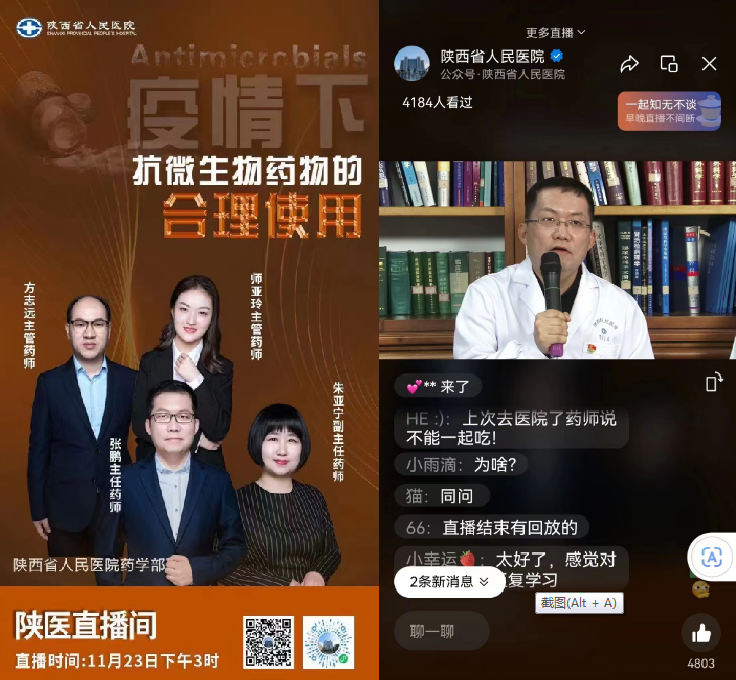 世界卫生组织将每年的11月18日到24日设定为“世界提高抗微生物药物认识周”,今年的主题是“齐心协力、遏制耐药”。为提高社会公众的认知水平,11月23日,六合彩网站药学部张鹏主任带领朱亚宁副主任药师、方志远主管药师和师亚玲主管药师做客陕医直播间,针对“疫情下抗微生物药物的合理使用”进行热点讨论。