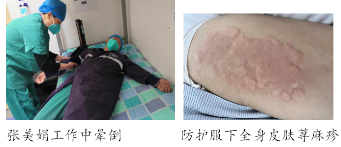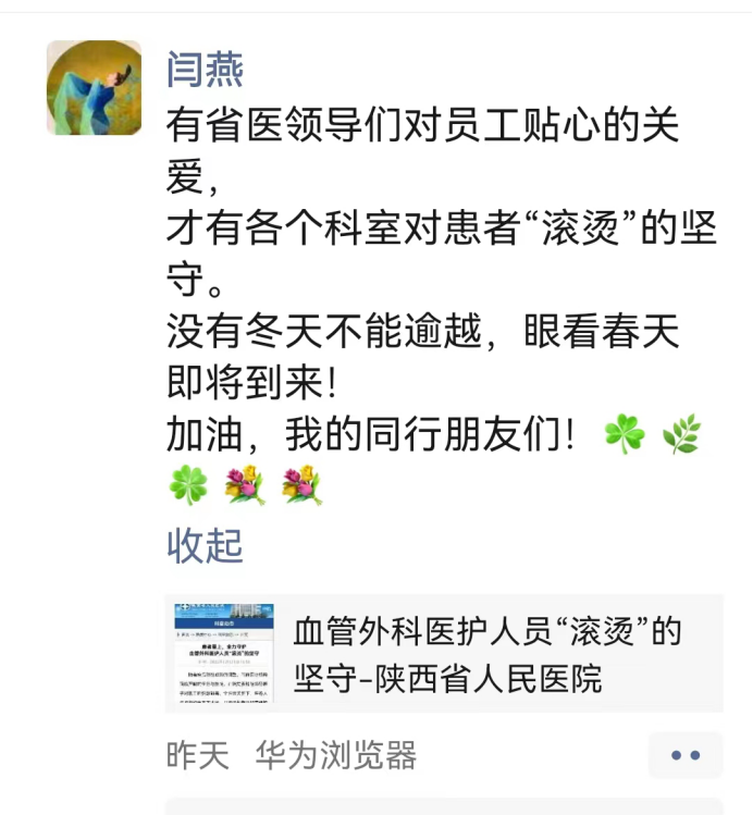 还有护士姚丹从二脱间出来,全身皮肤出现大片荨麻疹,让人看了心疼不已。团队里的很多医生护士都病了,但只要身体略微好转,都来坚持上班,他们深知医疗资源紧缺,有队员肌肉疼痛无法忍受时,张晶将自己的止痛药拿出来给大家缓解疼痛;王小娟护长声音嘶哑也一直坚持工作,她说自己是主心骨不能休息,要担责在先树立榜样,在这种特殊关键时期,发热门诊全体医护在保护患者的同时,自己却非凡的克服着病痛,选择坚守,是医者仁心的集中体现,是我们对这份工作最大的尊重;相信只要我们凝心聚力,坚定信心、全力以赴,让我们为了阳春的到来一起加油。
