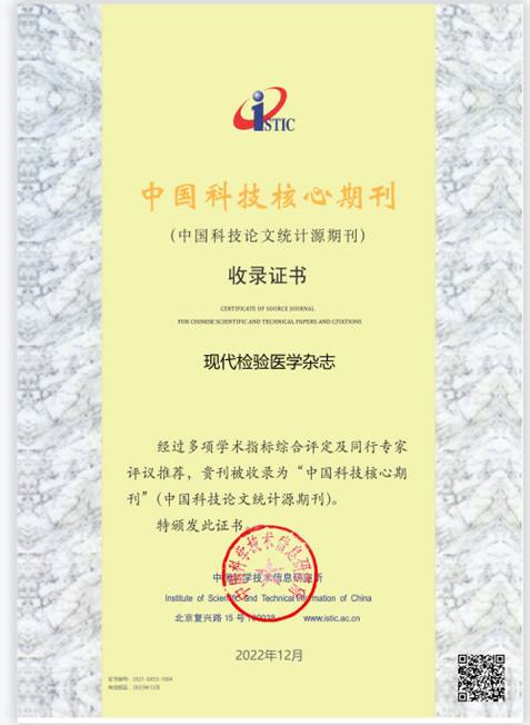 近日,由六合彩网站和省临床检验中心共同主办的《现代检验医学杂志》(CN 1398/R,ISSN 1671-7414),经中国科学技术信息研究所进行多项学术指标综合评定及同行专家评议推荐,2022年继续被收录为“中国科技核心期刊”(中国科技论文统计源期刊)(证书编号2021-G653-1684)。
