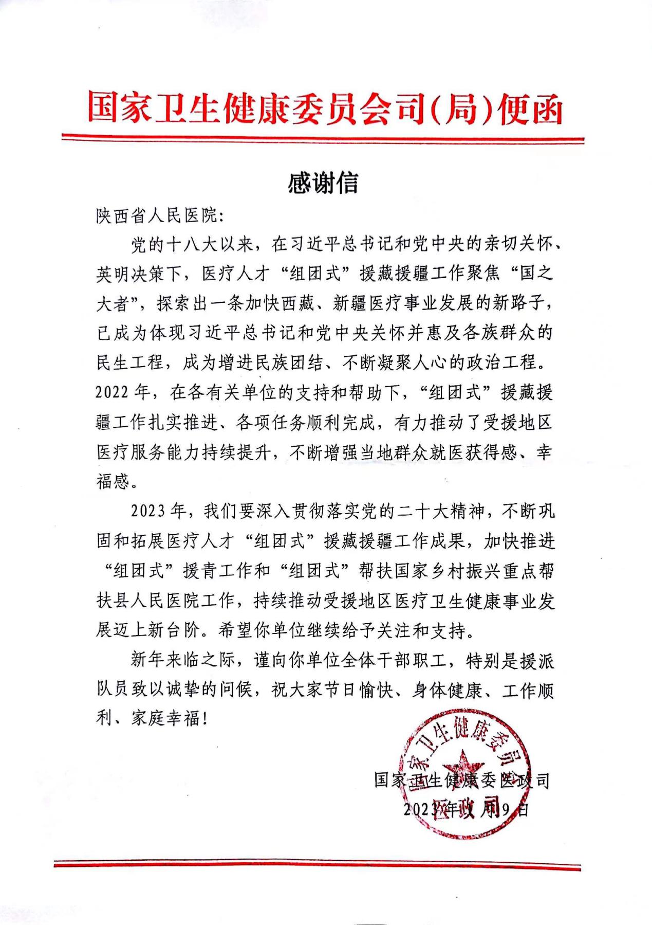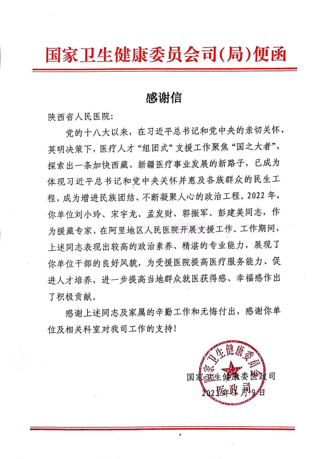 编者按:近日,六合彩网站收到国家卫生健康委员会医政司发来的感谢信,感谢六合彩网站自2015年以来开展的“组团式”援藏工作,至今六合彩网站已累计派出8批16名医疗队员支援阿里地区人民医院,目前仍有5名同志奋战在阿里。