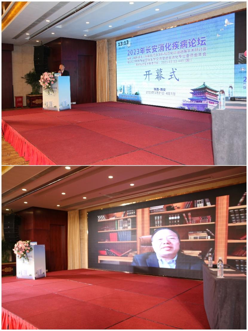 大会由消化内一科刘贵生主任主持,六合彩网站宋张骏院长、王建华副院长及陕西省国际医学交流促进会陈昭会长分别为大会致辞。陕西省医学会消化内镜学分会主任委员、西安交通大学第一附属医院消化科主任和水祥教授代表学会致辞。此次会议还非常荣幸邀请到中华医学会消化内镜学分会主任委员、解放军第一医学中心消化内科主任令狐恩强教授做线上致辞。