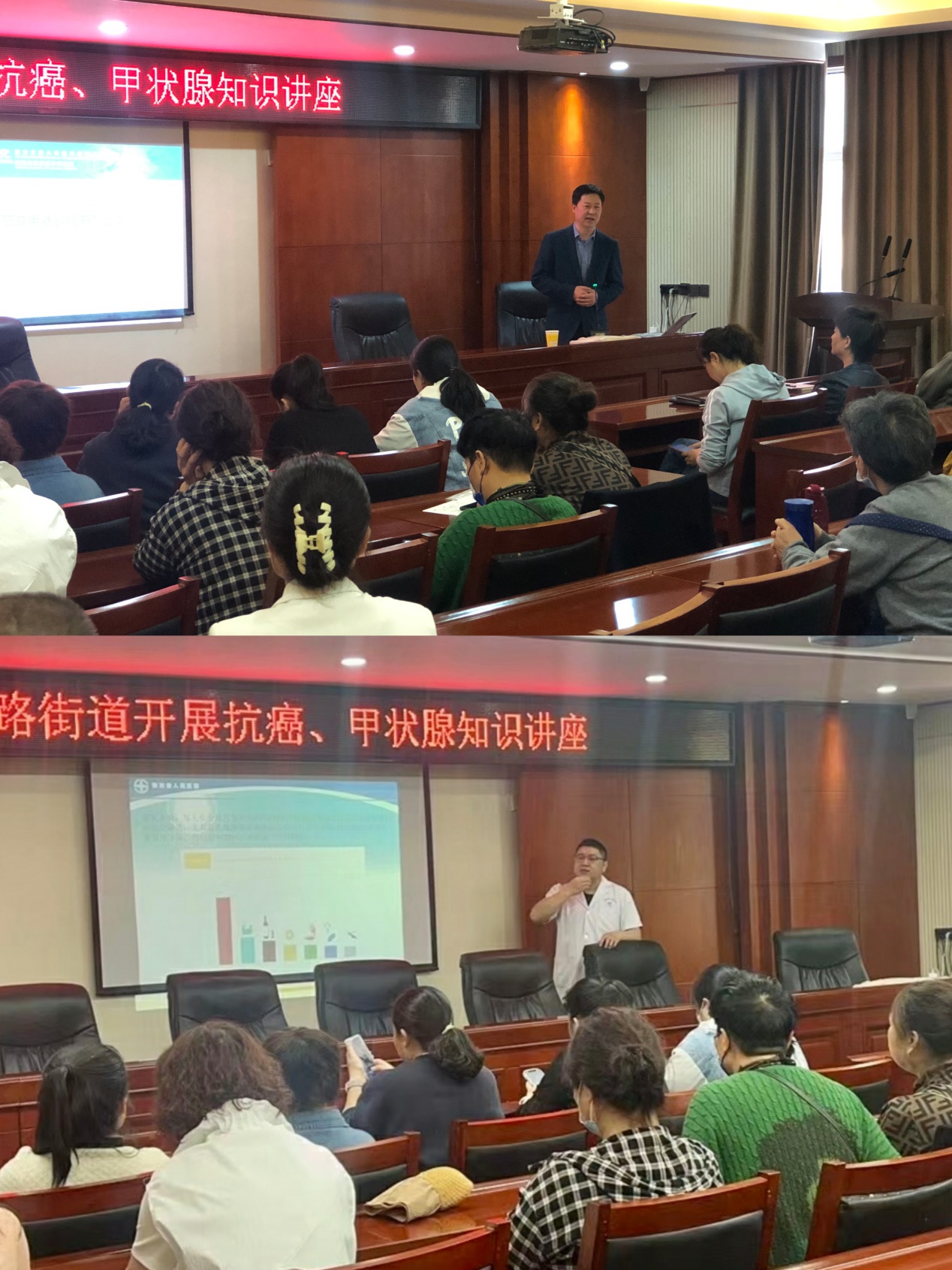 活动期间,李建辉主任用深入浅出的语言结合自身丰富的临床经验和大量详实生动的事例,向前来参加讲座的群众科普乳腺甲状腺健康筛查知识、超声在乳腺甲状腺疾病诊断中的作用以及近几十年来乳腺甲状腺手术方式的演进。李主任讲解到,随着外科理念进步以及抗肿瘤药物的研发,乳腺甲状腺癌的治疗已摆脱了粗放的扩大切除,迈向微创、精准、个体化治疗。作为治疗作用良好的癌肿,若不幸罹患上述疾病,也请勇敢面对,及时去正规医院就诊。随后,放疗科金龙医师用幽默风趣、通俗易懂的语言将柳叶刀杂志中关于健康运动的文献分享给社区群众,纠正运动和养生误区,积极倡导通过科学的体育锻炼提高身体素质,为自己和家人筑起⼀道有力的健康防线。