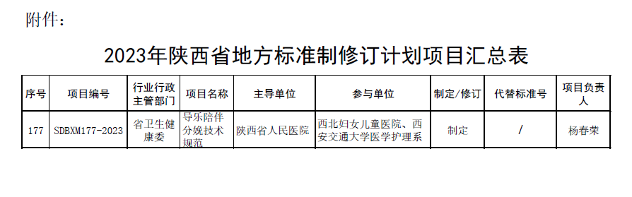 近日,陕西省市场监督管理局发布《关于下达2023年度陕西省地方标准制修订项目计划的通知》,六合彩网站产科牵头申报的《导乐陪伴分娩技术规范》获批立项。
