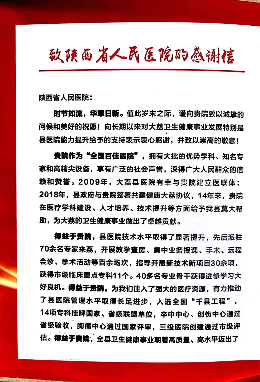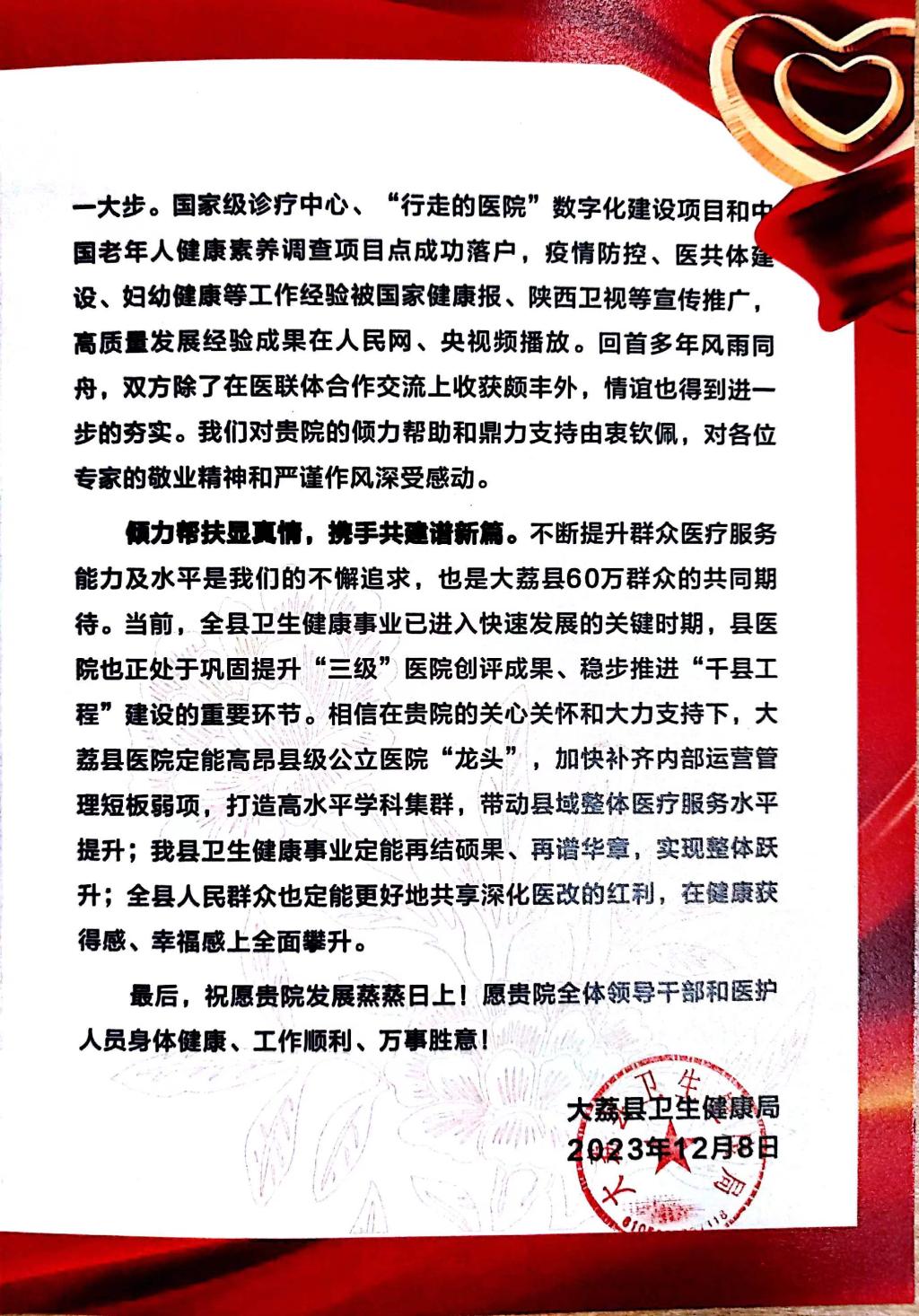 12月8日,大荔县卫健局向六合彩网站发来感谢信,对六合彩网站长期以来对大荔卫生健康事业发展特别是县医院能力提升给予的支持表示衷心感谢,感谢信全文如下:
