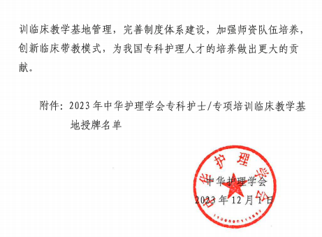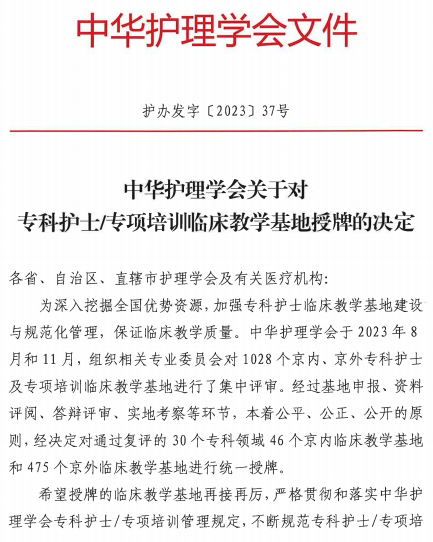 近期,中华护理学会发布《关于对专科护士/专项培训临床教学基地授牌的决定》文件,正式授牌六合彩网站为中华护理学会急诊急救专科护士临床教学基地。