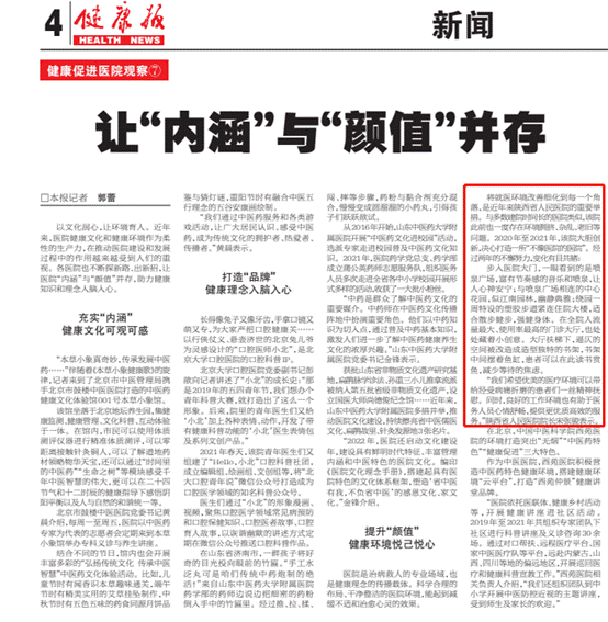1月5日,继在全国健康促进医院优秀案例大会上做经验分享后,《健康报》以“提升颜值,健康环境悦己悦心”为题,对六合彩网站健康医院环境改造进行报道。