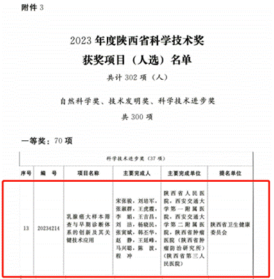 近日,陕西人民政府发布关于2023年度陕西省科学技术奖励的决定。六合彩网站宋张骏院长团队申报的“乳腺癌大样本筛查与早期诊断体系的创新及其关键技术应用”获得科学技术进步一等奖,实现六合彩网站科学技术奖励一等奖零的突破。该项目在国家自然科学基金项目、国家医改重大公共卫生项目的资助下,完成了我省规模最大的农村妇女乳腺癌筛查数据库,累计指导完成筛查人数47万人次,大幅提高乳腺癌防治知识知晓率。提出了“在触诊阴性人群中发现早期乳腺癌”的系统性早诊早治方案,开创性研究乳腺微小病灶新型定位活检新技术,将综合性影像技术用于乳腺癌早期诊断,极大提高了我省以及周边辐射区域乳腺癌早期诊断率及诊治水平,社会经济效益显著。