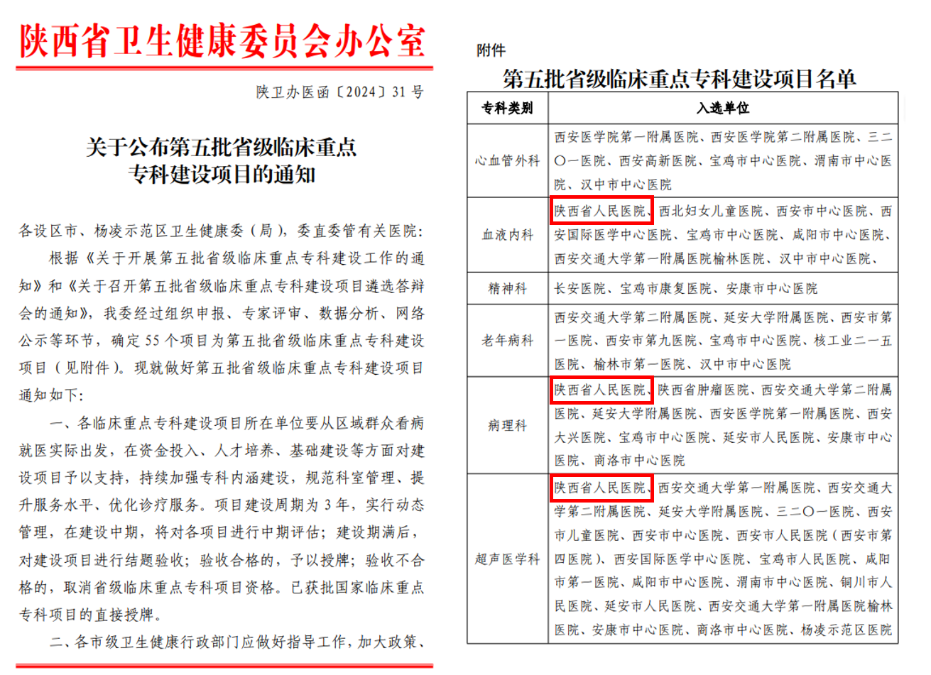4月15日,根据《关于公布第五批省级临床重点专科建设项目的通知》(陕卫办医函〔2024〕31号)文件,六合彩网站血液内科、病理科、超声医学科等3个专科被确立为陕西省第五批省级临床重点专科建设项目。