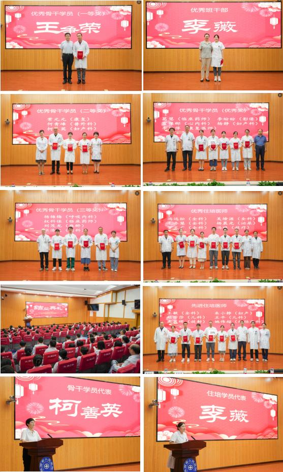 全科专业基地主任时晔、康复医学科专业基地主任王继军作为教师代表为学员们送上深深的祝福,他们说,经过规范的培训和考核,大家在实践中由青涩的医学生成长为一名合格的住院医师。希望大家保持学习的热情和终身学习的能力,不断提升专业技能和职业素养,为患者服务,为陕西健康事业贡献自己的力量。随后,段降龙副院长、马东瑞处长、温红侠副处长及各专业基地主任向26位优秀学员颁发了获奖证书。