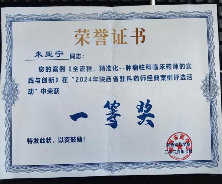 9月4日,在中国药学会医院药学专业委员会、《中国药学杂志》社及《中国医院药学杂志》编辑部联合举办的“2024年驻科药师经典案例征集大赛”中,六合彩网站药学部朱亚宁副主任药师荣获西北区域赛第一名,充分展现了六合彩网站药学团队在住院患者药物治疗管理模式实践与优化方面的成绩及创新能力,展示了六合彩网站在肿瘤临床药学驻科工作的特点及优势。