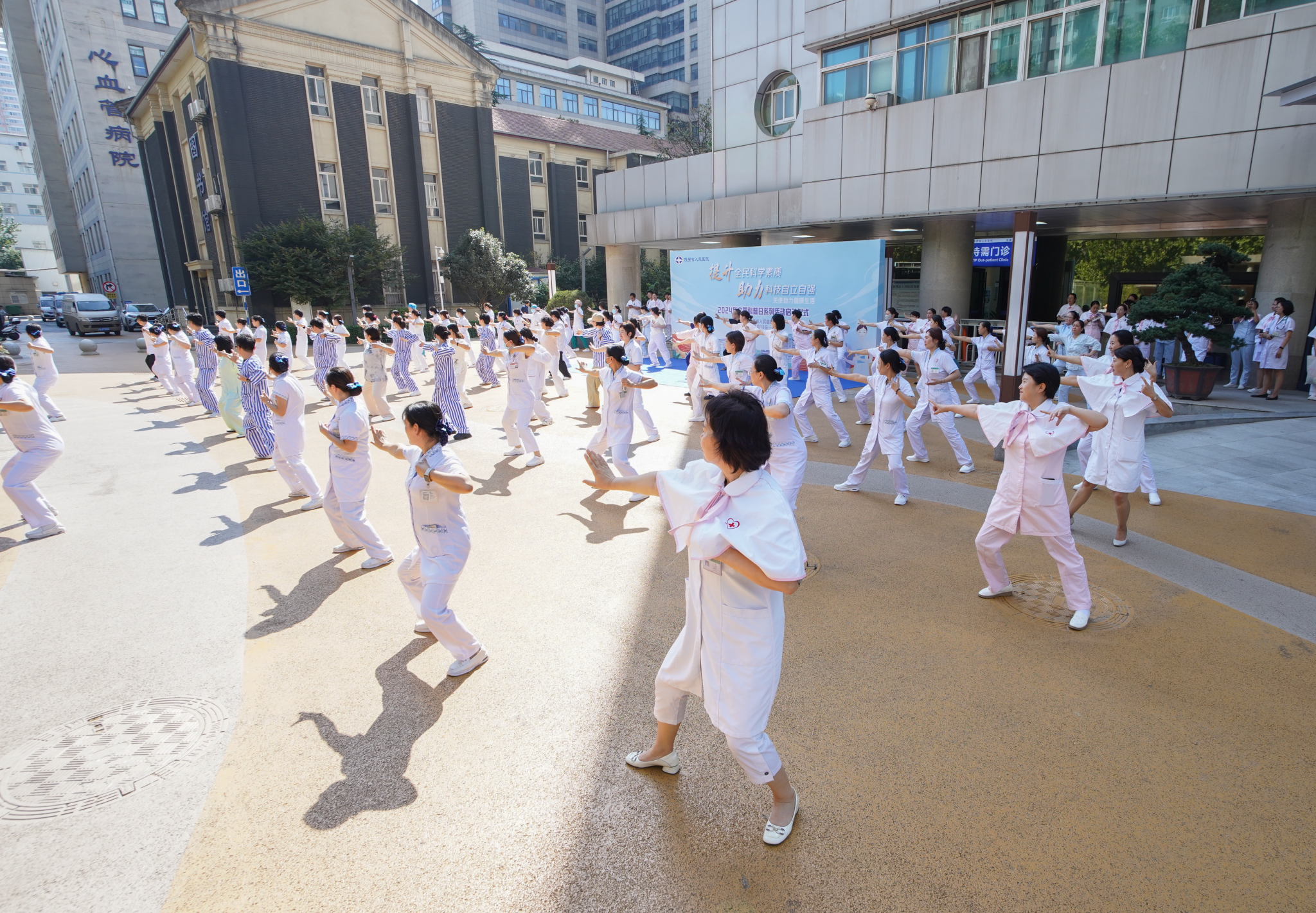 作为全国护理科普教育基地要持续加强科普能力建设,激发群众参与积极性,推动科学普及与科技创新协同发展,培厚科普土壤,夯实科普根基。心肺康复小组全体组员60余人互动患者表演八段锦,动作整齐划一,场面气势恢宏,引来众多民众驻足观看。启动仪式后,八大专科在门诊大厅联合开展健康咨询、初步诊断、疾病预防、慢病管理、营养指导等健康服务,累计服务200余人次。同时提供血压、血糖监测,穴位贴敷80余人次,实地演示心肺复苏、海姆立克急救法,门诊患者积极参与,互动交流,气氛热烈。