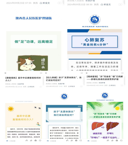 9月18日-24日,护理部以长安护理公众号为平台,聚焦慢病管理、妇儿保健、康复锻炼、急救技能、伤口管理、安宁疗护六大主题,经过精心谋划组织、统筹工作协同,部署全院21个科室推送护理科普文章22篇,护理科普小组推送短视频6部,借助新媒体展示了科普成效价值,提升了公众参与度,营造了浓厚氛围。
