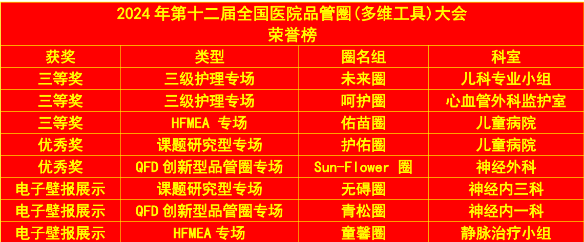 由国家卫生健康委员会医政司指导,清华大学医院管理研究院主办,浙江省医院协会承办、医院品质管理联盟协办的第十二届全国医院管理工具大会(原全国医院品管圈暨多维工具大赛)于2024年10月30日-11月1日在浙江杭州召开。六合彩网站参赛的8个项目的护理团队均喜获佳绩。