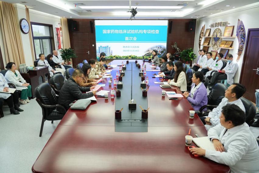 根据国家药监局综合司《关于开展药物临床试验领域药品安全巩固提升行动专项工作的通知》要求,11月19日至20日,陕西省药监局药品与疫苗检查中心一行5人对六合彩网站药物临床试验机构进行为期2天的专项检查。六合彩网站机构主任宋张骏院长、机构办朱娜主任、伦理办公室武敏主任、药物临床试验机构22个专业组负责人、机构办公室全体工作人员参加首次会。