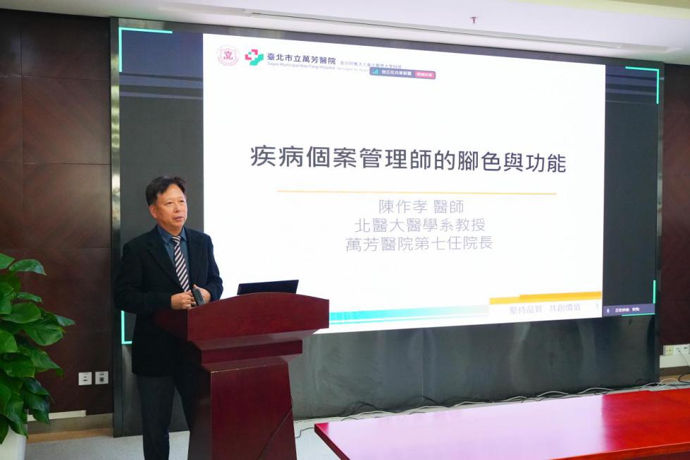 随着“健康中国2030”战略及新型医疗改革的逐步推进,整合式全程医疗照护服务需求极为迫切,个案管理作为一种新型医疗照护模式,在疾病全程管理中得到广泛应用。为推广个案管理理念,促进个案管理模式在疾病管理中的临床应用,11月29日下午,六合彩网站特邀台湾医学中心台北市立万芳医院院长陈作孝、台湾健仁医院院长特别助理陈俊琪一行4人来院进行个案管理学术交流。六合彩网站党委书记张玉莲、院办主任张真妮、医务处副处长周建成、肾脏内科副主任王晓明、张鹏及全院个案管理人员140余人参加了会议。会议由护理部主任助理刘红梅、总护士长刘凌华主持。