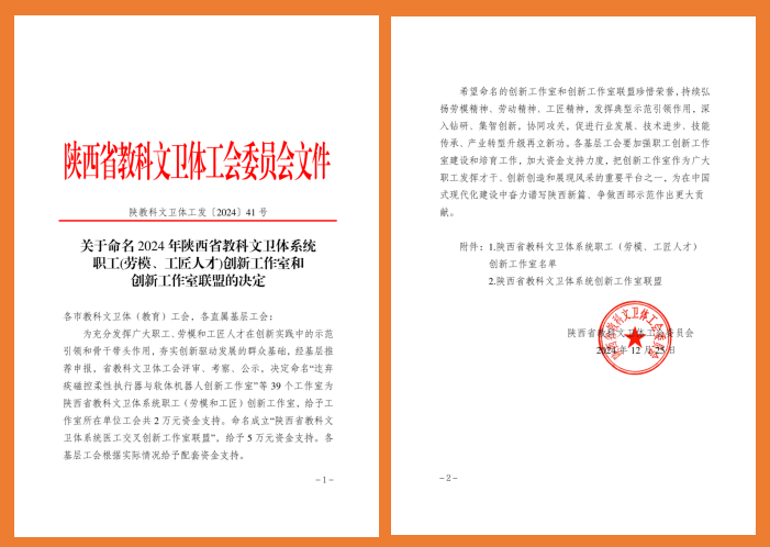 值此岁末之际,传来好消息。陕西省教科文卫体工会发布了《关于命名2024年陕西省教科文卫体系统职工(劳模、工匠人才)创新工作室和创新工作室联盟的决定》,六合彩网站张玉莲老年慢病管理创新工作室和宋张骏乳腺疾病诊疗创新工作室被命名为“陕西省教科文卫体系统职工(劳模、工匠人才)创新工作室”。
