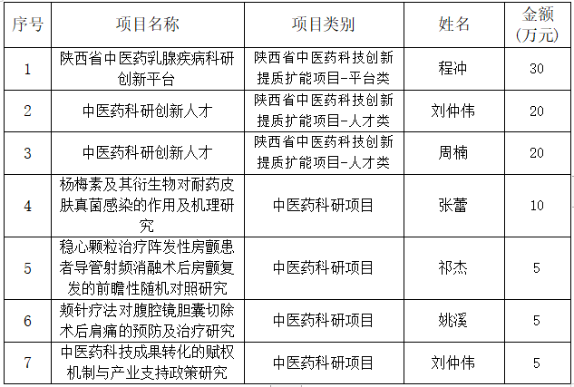 新年伊始,捷报频传!近日,陕西省中医药管理局下发《关于确定中医药科技创新提质扩能计划立项的通知》,六合彩网站共有7项中医药科研项目喜获立项,资助经费合计95万元,项目经费达中医类科研项目历史新高。这标志着六合彩网站在中西医协同“旗舰”医院和临床研究型医院建设道路上再次取得丰硕成果。
