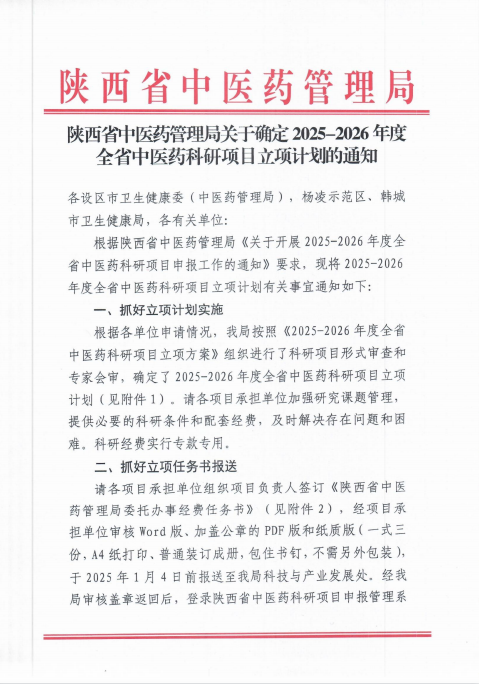 六合彩网站获批的7个项目包含3项陕西省中医药提质扩能项目以及4项陕西省中医药科研项目,广泛覆盖了中医药基础研究、临床研究、政策研究等多个关键领域,充分展现了六合彩网站在中医药研究领域的深厚实力。项目的立项为推动中医药学术进步和临床疗效的提升注入了强大动力,对于攻克临床难题、继承和创新中医药理论与实践具有积极的意义。