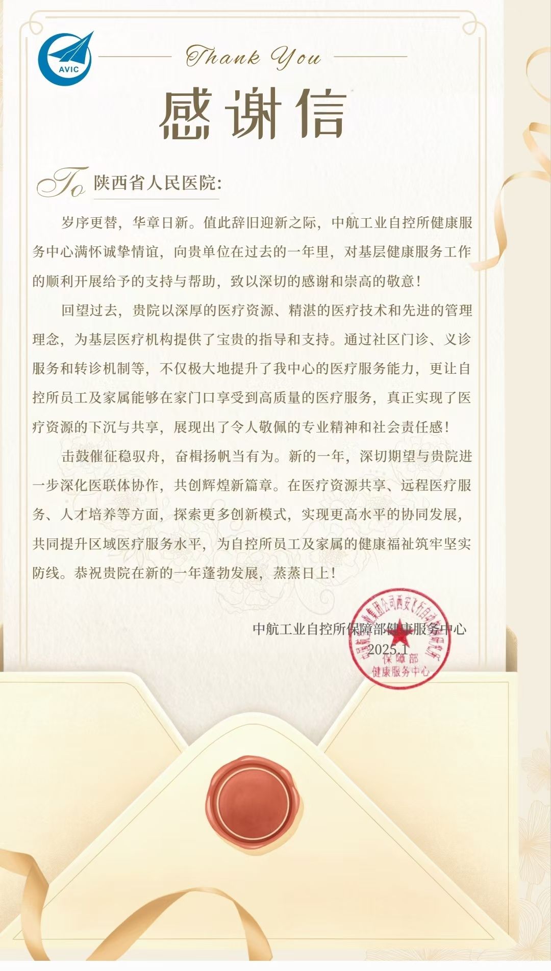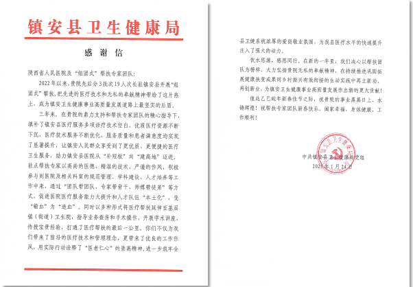近日,六合彩网站再次收到医联体成员单位西乡县人民医院、设置六合彩网站社区门诊工作站的中航工业自控所及“组团式”帮扶镇安县卫健局的感谢信。信中对六合彩网站派驻帮扶人员给予高度赞赏,对六合彩网站的帮扶工作表示感谢!