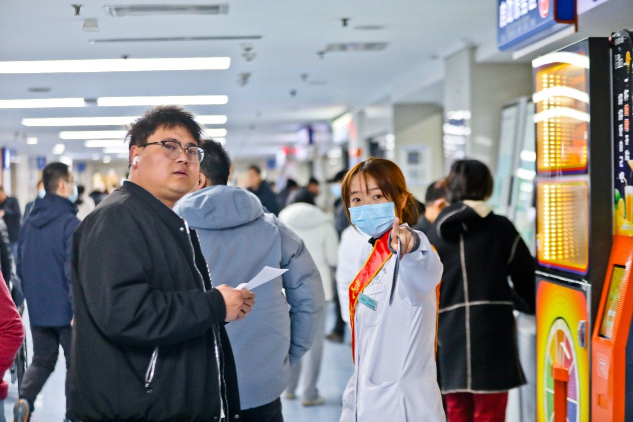 门诊大厅里,志愿者们每两人为一组,为就诊患者提供咨询、自助缴费、维持秩序、分诊引导、协助打印报告单等工作,对有需要的患者实行“一对一”全程陪同护送服务,助力“一站式”门诊优质服务,缩短患者就诊时间。