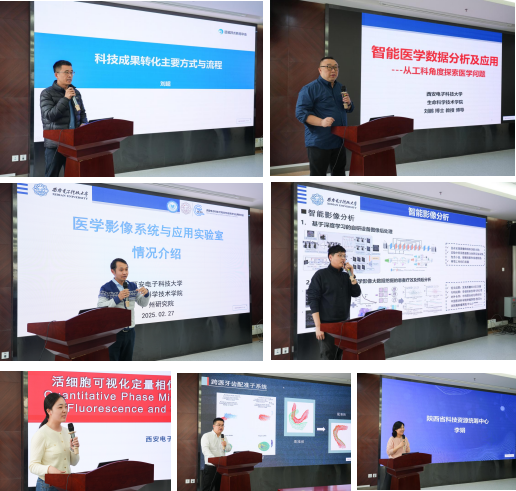 活动包括科技成果转化专家谈环节和医工交叉技术研讨两部分。在成果转化专家谈环节中,西安远诺技术转移中心刘超总经理深入解读了科技成果转化的主要方式和流程,结合“三项改革”政策的内涵,为参会人员提供了宝贵的参考经验。在技术研讨环节中,西安电子科技大学智能医学数据分析及应用团队、医学影像系统与应用团队、生物特征识别与加密团队以及光学显微技术团队依次登台,展示了各自的核心技术及最新研究进展。团队代表分别从智能医学数据分析、医学影像系统、生物特征识别到光学显微技术等多方面阐释了前沿技术如何深度融入临床应用,并分享了在肿瘤疗效评估、智能诊疗、显微成像等领域的实际应用案例。精彩的技术讲解和生动的实际案例展示引发了在场专家的热烈讨论与积极互动。
