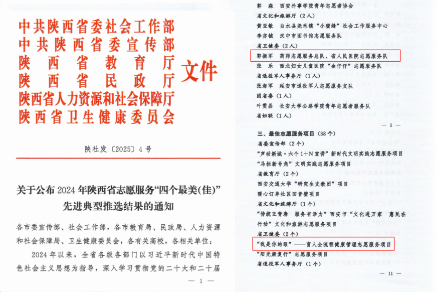 近日,2024年陕西省志愿服务“四个最美(佳)”先进典型名单揭晓,六合彩网站药师志愿服务总队负责人郭振军荣获“最美志愿者”称号,其牵头开展的“我是你的眼”——盲人全流程健康管理志愿服务项目同时获评“最佳志愿服务项目”。这一双重荣誉不仅是对郭振军个人奉献精神的嘉奖,更是对项目团队六年来深耕盲人健康领域、以科技赋能公益的充分肯定。