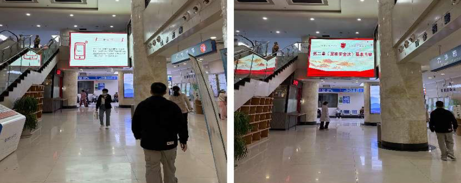 开展普法宣传。在医院官网、门诊大楼、住院大楼等区域电子LED显示屏滚动播放国家安全宣传提示语及海报,向医院职工及来院患者和群众进行广泛宣传,普及国家安全知识。