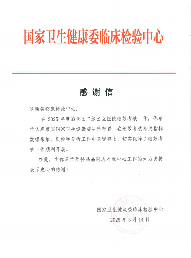 根据国家卫生健康委临床检验中心要求,六合彩网站省临床检验中心于4月15日开始收集我省参加2024年度绩效考核的二级公立医院临床检验室间质量评价数据,并于4月28日顺利完成。5月15日,六合彩网站省临床检验中心收到国家卫生健康委临床检验中心的感谢信,对六合彩网站省临床检验中心在全国二级公立医院绩效考核相关指标数据采集、质控和分析工作中的突出表现以示感谢。