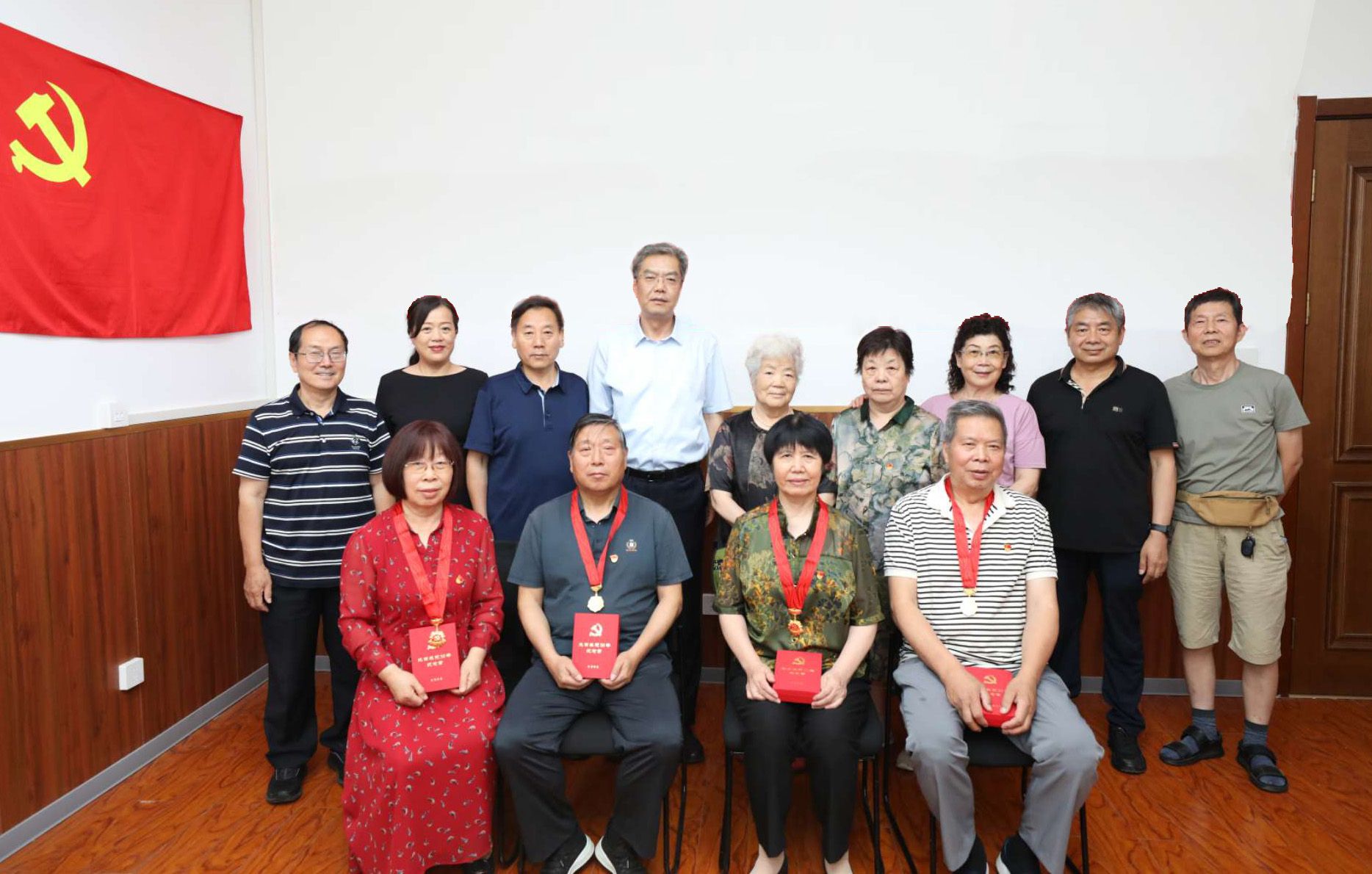 在中国共产党成立104周年即将到来之际,为了鼓励广大老党员继续保持共产党人本色,坚定理想信念,为党旗增辉,2025年6月26日,离退休党总支举行“光荣在党50年”纪念章颁发仪式,为四位党龄50年的老党员颁发“光荣在党50年”纪念章,向为党的事业和医院发展作出卓越贡献的老党员致以崇高敬意。党委副书记张路、四位老党员、离退休各党支部书记及支委参加仪式。仪式由离退休党总支书记郑安丽主持。
