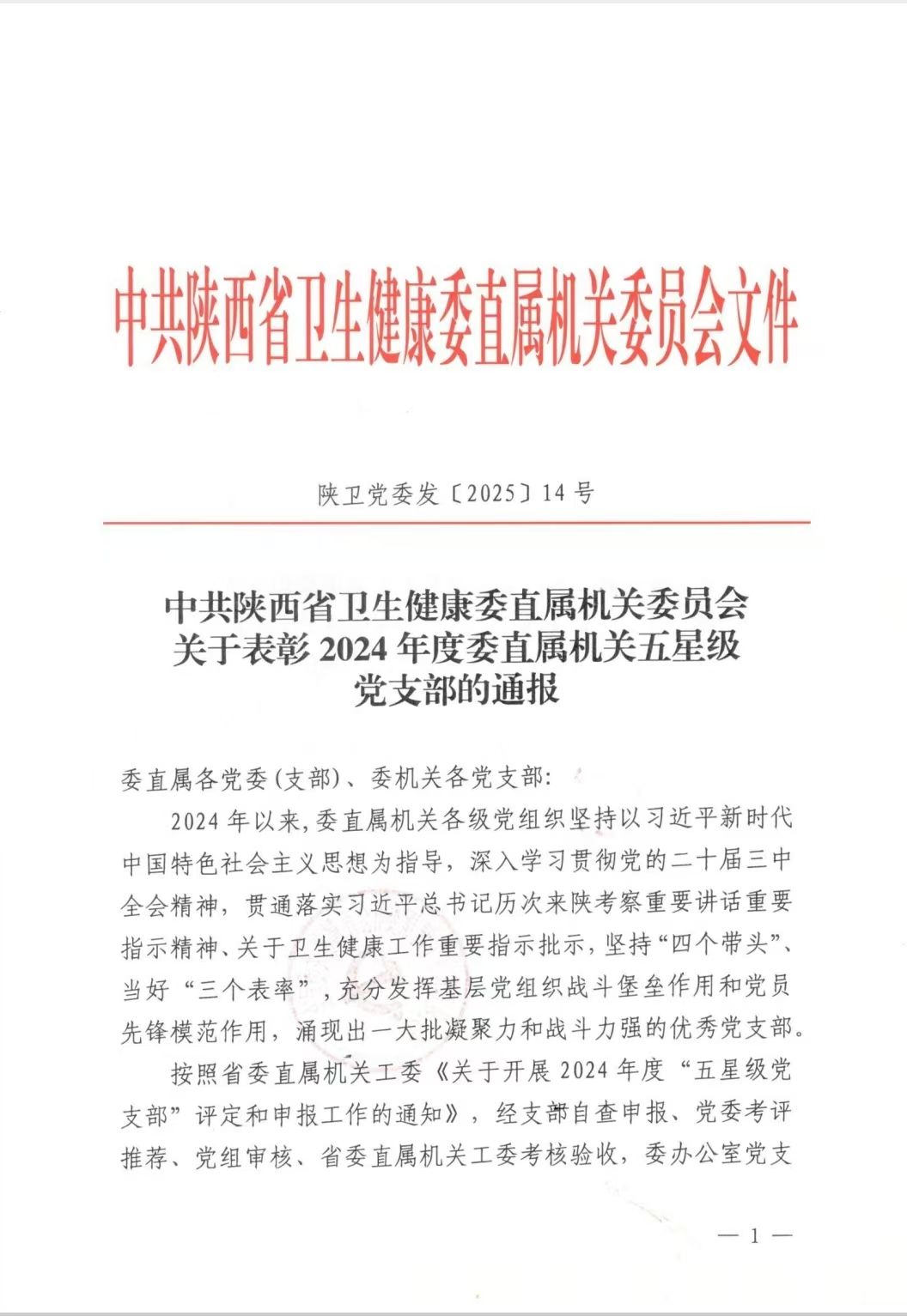 六合彩网站创建星级党支部工作再创佳绩。近日,中共陕西省卫健委直属机关委员会下发《关于表彰2024年度委直属机关五星级党支部的通报》,六合彩网站共有19个党支部荣获五星级党支部荣誉称号,这一成绩充分展现了六合彩网站基层党组织建设的坚实基础与工作成效,为医院党建工作的高质量发展注入了强大动力。