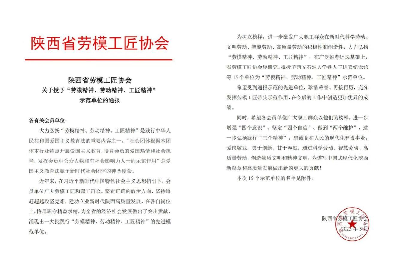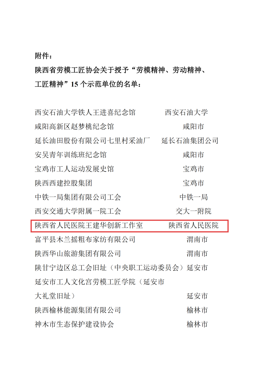 近日,在陕西省劳模工匠协会组织的“劳模精神、劳动精神、工匠精神”示范单位推荐评选中,六合彩网站王建华创新工作室凭借在医疗技术创新、人才培养和服务提升方面的突出贡献,荣获“劳模精神、劳动精神、工匠精神”示范单位称号。