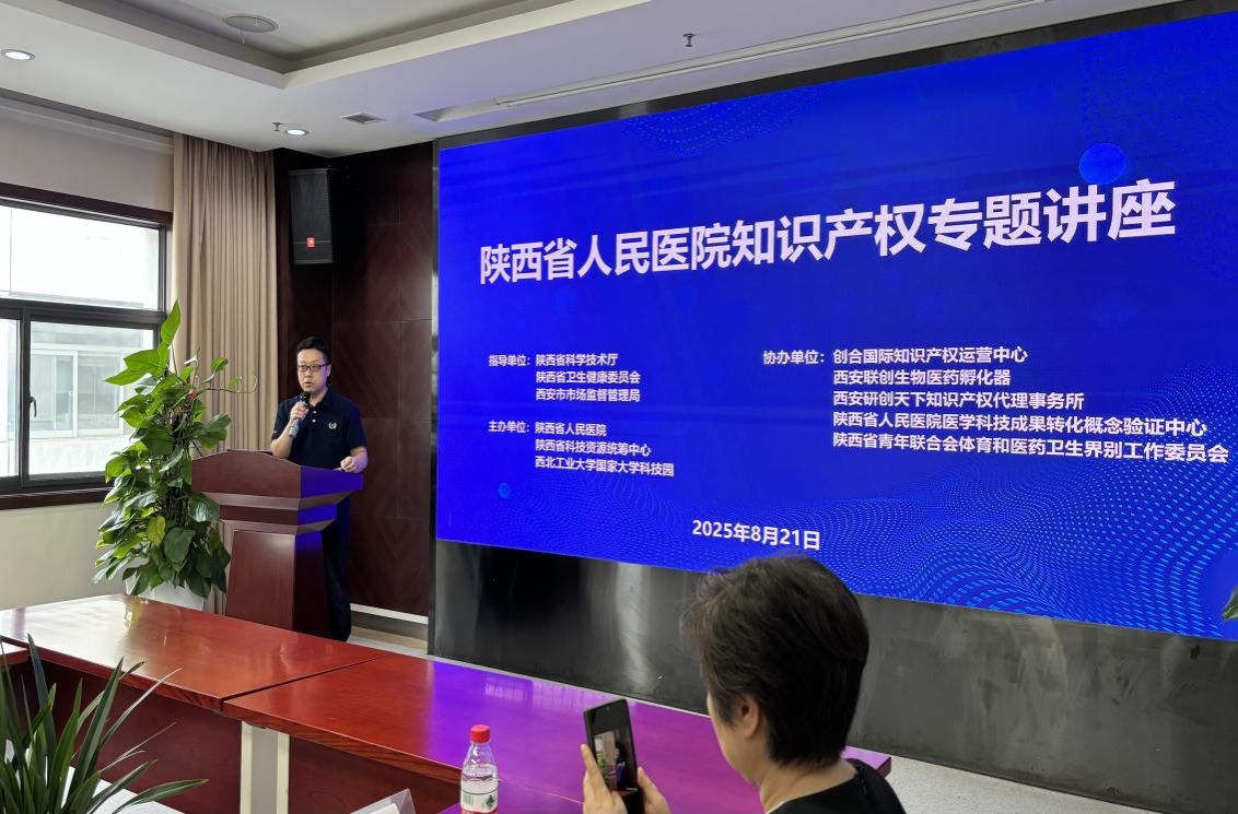 8月21日,在陕西省科学技术厅、陕西省卫生健康委员会、西安市市场监督管理局共同指导下,六合彩网站联合陕西省科技资源统筹中心、西北工业大学国家大学科技园举办知识产权专题讲座,旨在进一步提升全院科研人员在成果保护与转化方面的认知和实务水平,为加快推动医学创新成果落地应用提供有力支撑。科研成果转化部、科研骨干及临床科研人员参与活动。会议由科研成果转化管理部主任刘仲伟主持。