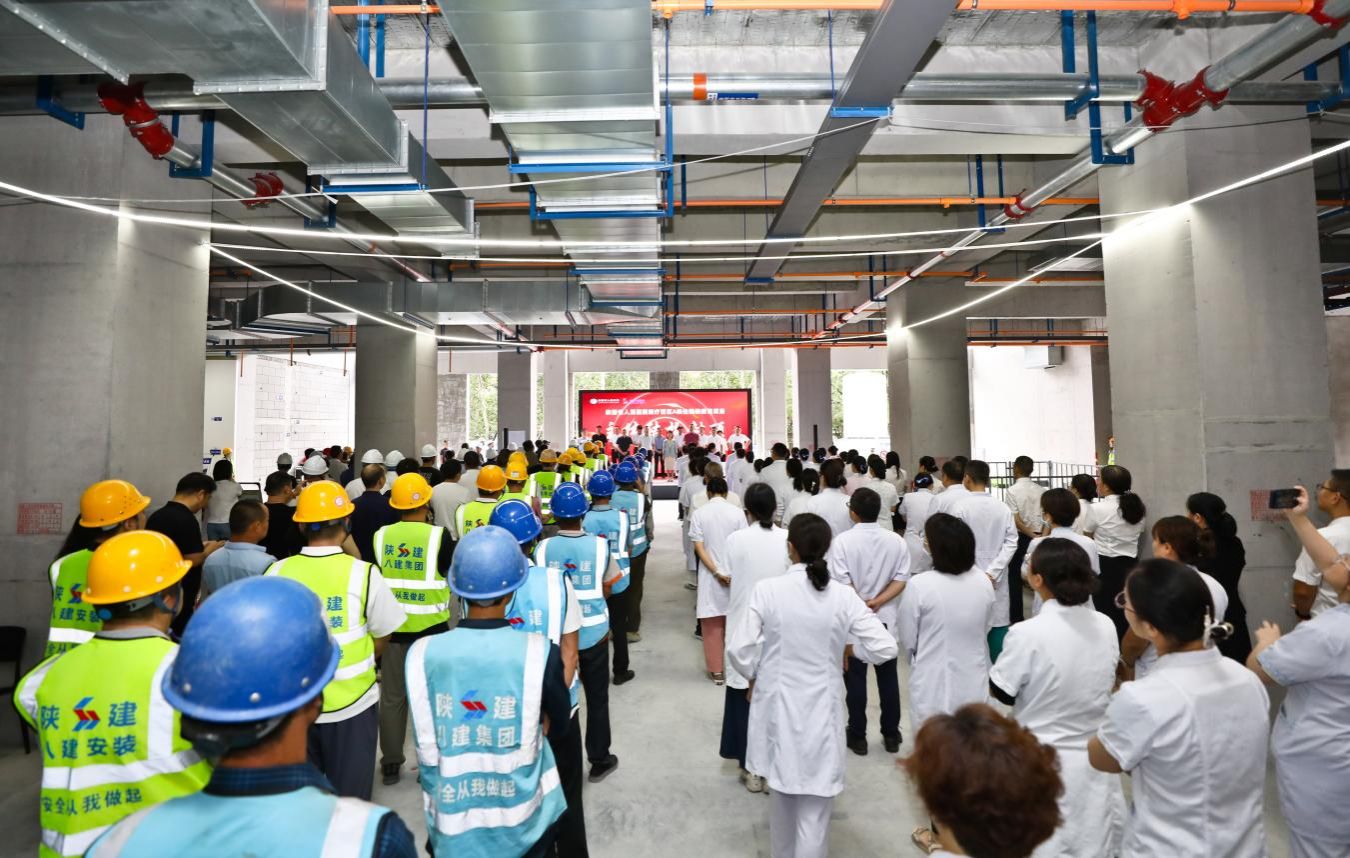 宋张骏院长讲话并代表医院向各级领导、参建单位和全院职工表示感谢。他强调,A栋住院楼是医院落实“健康中国”战略、推动公立医院高质量发展、优化“一院两区”功能布局的重大举措。大楼的封顶不仅是建设任务的重要节点,更是医院提质扩容、改善服务的新起点。他希望各参建单位继续保持严谨作风,严把安全质量关,确保工程如期竣工;要求全院各部门提前谋划大楼启用相关准备工作,实现从建设到运营的高效衔接,最大限度发挥新大楼的医疗服务效能。