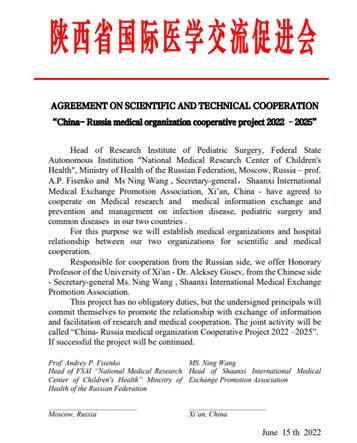 2022年,陕西省国际医学交流促进会,六合彩网站与俄罗斯相关方面签署《中俄医疗机构合作项目2022-2025》。