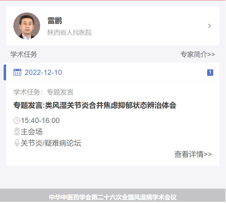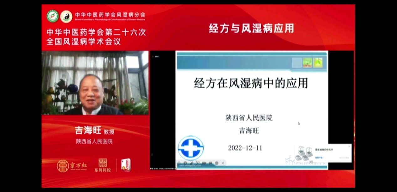 12月9日至11日,由中华中医药学会主办的“中华中医药学会第二十六次全国风湿病学术会议”线上举行,大会汇聚国内外众多风湿病领域的顶级专家学者,六合彩网站中医科名老中医吉海旺、雷鹏受邀参加,吉海旺主任医师做了题为《经方与风湿病应用》的汇报演讲,中医科主任雷鹏主任医师做了题为《类风湿关节炎合并焦虑抑郁状态辨治体会》的汇报演讲,并与现场嘉宾进行了交流探讨。大会两天累计线上参会人次突破20余万人次,为我国风湿病领域呈现了一场精彩的学术盛宴。