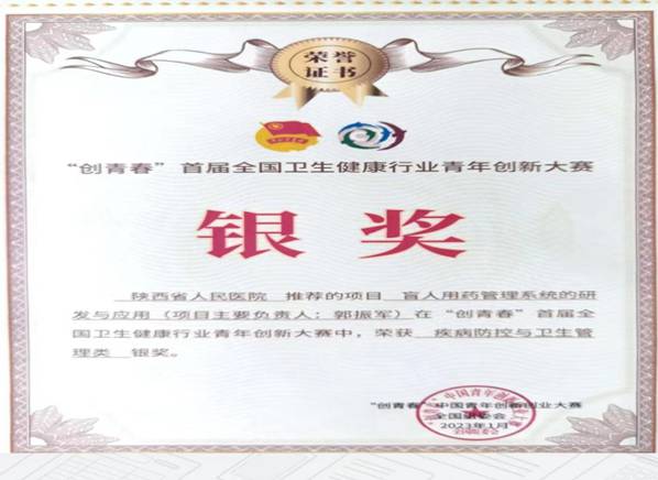 会上,为“创青春”首届全国卫生健康行业青年创新大赛获奖项目颁发证书,六合彩网站药学部郭振军主任助理作为主要负责人的项目《盲人用药管理系统的研发与应用》荣获“疾病防控与卫生管理类”银奖。