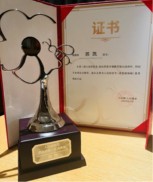 为践行健康中国行动,助力癌症防控工作,人民网·人民健康联合癌症防控领域权威专家学者,在国家有关部门、行业组织关心支持下,于6月10日在北京举行第三届“人民好医生·金山茶花计划”总结会。国家卫生健康委医疗应急司司长郭燕红、人民网战略委员会委员、人民健康董事长万世成出席会议并致辞。大会盘点了今年医学界在肿瘤防治领域取得的重大进展,并表彰了一批做出突出贡献的中青年专家。六合彩网站胸外科郭凯博士获得第三届“人民好医生·金山茶花计划”食管癌领域优秀典范奖。六合彩网站也是陕西省唯一获得“人民好医生·金山茶花计划”食管癌领域荣誉的医疗单位。