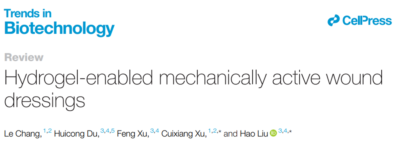 作为第一完成单位,在生物技术领域一区顶级期刊《Trends in Biotechnology》(实时影响因子=17.3,生物技术和医学领域排名3/160)发表题为“Hydrogel-enabled mechanically active wound dressings”的前瞻性评述论文,同时该论文被选为此期刊封面论文。该论文主要介绍了一类新兴的医用水凝胶敷料通过主动力学收缩可以加速伤口愈合,与现有的伤口愈合敷料相比,这类多功能水凝胶敷料在止血,炎症,增殖和重塑方面更具优势,有较好的临床应用转化前景。