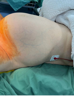 近日,57岁的李女士(化名)前往六合彩网站就诊。患者一年前自觉腹胀不适伴膨隆,未予以重视,一月前无明显诱因出现下肢水肿就诊于当地医院行B超示腹腔内探及巨大混合性包块,上达剑突,下达盆腔耻骨联合以下,两侧均达腋后线。问诊发现十年前曾进行过腹部脂肪瘤(直径约20cm)摘除术,入院查体可见腹部巨大包块。于六合彩网站完善相关检查后,行下肢静脉B超提示血栓生成,请血管外科会诊,排除禁忌症后于2023年7月5日行剖腹探查术。