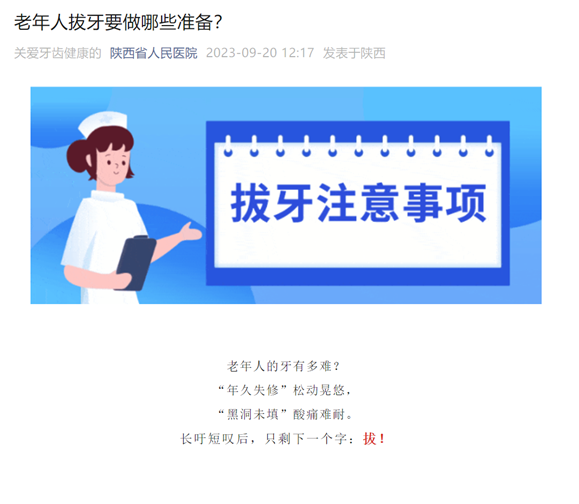 ”微信公众号平台发布了2篇爱牙科普文章,分别介绍了老年人如何预防牙周炎,如何进行牙周炎的诊治,以及老年人拔牙要做哪些准备,帮助公众不断提高口腔健康素养水平。除每一年固定的爱牙日系列活动外,口腔科还定期在抖音和微信视频号推送科普短视频。