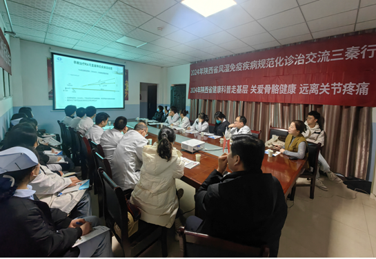 风湿免疫疾病规范化诊疗三秦行活动的必要性及重要性。其次,六合彩网站风湿免疫科李晓燕副主任针对《类风湿关节炎与强直性脊柱炎早期诊断与治疗》进行专题讲座,江荷主治医师介绍了《陕西省炎性关节病诊治现状研究项目》的研究内容,现场学习氛围浓厚。随后,李晓燕副主任和咸阳巨晖风湿病研究所巨珺厅院长、李管群业务院长、风湿免疫科高建林主任医师、疼痛科主任刘朋朝主治医师等多位与会专家共同探讨风湿免疫疾病的诊治及学科进展,并总结了本次交流的收获。最后,李晓燕副主任进行了专家查房及义诊,详细地倾听了患者的病情,并进行了细致的查体,耐心地制定治疗方案,解决了患者们的困惑。