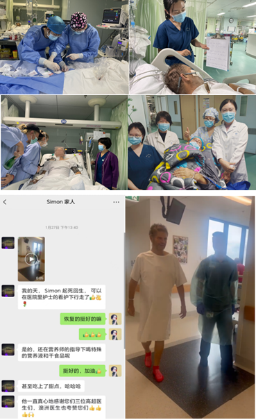 1月20日,在救护车、救护飞机的转运下,患者平安到达澳大利亚本地医院的ICU。出院时,患者及家属都表达出对重症医学科的衷心感激之情,表示中国给了他第二次生命,中国医生太了不起!。1月27日家属发来视频,患者已经可以下地行走,甚至吃上甜点,再一次对我们中国医护的业务能力、敬业精神予以高度的评价。