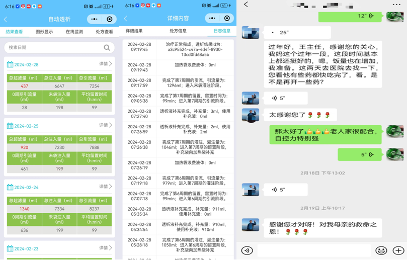 回家后,患者接到医护人员的询问电话,原来医护端收到远程实时数据发现透析液引流不畅,询问及指导其及时处理。随后,腹膜透析专科护士结合近几日出超情况,在医院端更改透析处方,患者家的腹膜透析机收到指令后按照新方案执行,这一切都随着物联网悄无声息的进行。1周后,家属特地告知患者已经自己能在屋内活动,食欲也明显改善,对医护人员表示感谢。