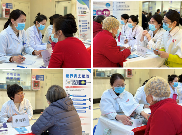 3月11日上午,眼科青光眼团队在门诊大厅进行义诊活动。王建萍主任医师、杨乐副主任医师、李雪颖主治医师、李迪主治医师、彭洁住院医师及刘莉莎护士长、海晨副护士长等眼科医护人员为前来咨询的患者进行了免费的眼部检查及测血压等服务,宣讲青光眼防治知识,提醒大家若出现眼睛胀痛和视力下降等症状应及时就医。眼科青光眼专家们就什么是青光眼、青光眼的症状、危害、高危人群及青光眼的治疗、用药及预防等知识进行细致地讲解,并耐心解答了患者关于青光眼等眼病的疑问。此次义诊共发放青光眼防治宣传手册50余份,义诊人数达到80余人次,筛查出青光眼患者3名,其中2名于科室住院进一步治疗。