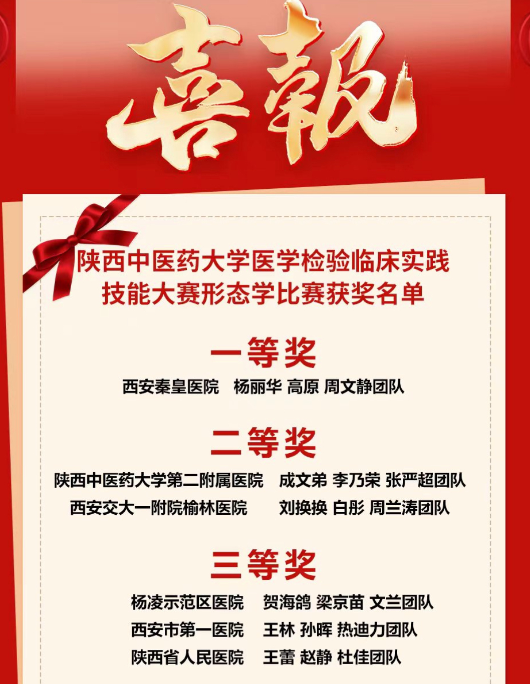 3月29日,陕西中医药大学组织举办师生联合“医学检验临床实践技能大赛”,来自全省10个地市的近20所医院的实习带教老师和实习生选手齐聚一堂,展开检验技能大比拼。此次技能大赛分设形态学、实习带教老师教学能力两个赛道。六合彩网站检验科王蕾老师、赵明老师、赵静老师及杜佳同学参加此次大赛。经过激烈角逐,六合彩网站检验团队赛出了水平,展现了精湛的专业能力和个人风采,王蕾老师,赵静老师和杜佳同学团队荣获“形态学大赛三等奖”,王蕾老师、赵明老师荣获“实习带教老师教学能力三等奖”。