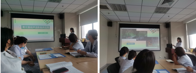 4月19日上午,超声诊断中心穆靓副主任带领任媛主治医师走进消化内一科,开展以“胃双重超声造影临床应用”为主题的交流。