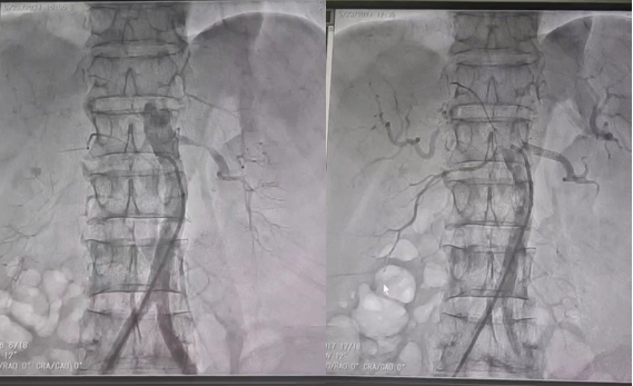 患者系中年男性,自觉乏力伴头晕于六合彩网站西咸院区肾内科就诊。王琼主治医师在诊查中发现患者肾功能中度损伤伴高血压及高钾血症,血压高达180/90mmhg,肾脏超声提示左肾动脉起始段明显纤细。考虑到左肾动脉局部明显狭窄,严重影响肾灌注及功能,但行传统的外科手术治疗创伤大,恢复慢,患者接受度低,结合患者情况,闫晓辉副主任医师和微创介入科陈思攀主任详细评估病情后,为患者制定了安全、有效的微创手术方式,即“左肾动脉造影及成形术”。医患双方充分沟通,并取得患者及家属的同意后,手术由微创介入科团队完成。在进行了多角度肾动脉造影后,精准测量左肾动脉狭窄段的长度、形态等参数,通过纤细导管将肾动脉专用支架送入肾动脉狭窄段,再次造影确认肾动脉狭窄段消失,血流明显恢复通畅,手术顺利结束。患者安返病房。
