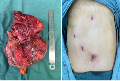 在豆亚伟主任、郭凯副主任及麻醉科宋宇龙副主任的通力配合下,手术仅用3小时就顺利结束,为患者完整切除形似“葫芦”的巨大肿瘤。术中腹部操作完全微创化,仅留有2个1cm和2个0.5 cm的微小切口,侧胸切口也仅约6cm,即将长达15cm的巨大“葫芦”取出体外,做到了健康与美观兼得。术后,在袁金艳护士长、马甜副护士长带领的胸外科优秀护理团队的精心护理下,韩女士恢复良好,实现了快速康复出院。
