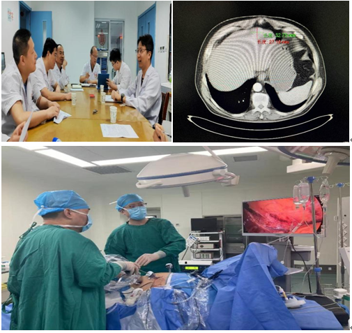 患者男性,70岁,发现肝脏占位性病变就诊于蓝田县人民医院外二科,入院后查体一般状况可,完善腹部CT平扫+增强及腹部MRI均提示肝左叶占位病变,不排除肿瘤可能。严翔医生与县医院孙瑞平主任详细阅片后高度怀疑肝脏占位系肿瘤可能性大,未见远处转移征象,结合患者实验室检查,体力状况评分PS 0分,Child-Pugh评分5分A级,无明显手术禁忌。严翔医生与患者家属充分沟通病情及手术风险,同意拟行腹腔镜下肝部分切除术。术前,严翔带领科室建立并规范肝脏肿瘤MDT讨论,孙瑞平科主任主持,查正凯副院长、医务科及全体外二科医护人员、影像科、麻醉科、病理科、手术室护理部等相关科室人员共同参与,完善术前准备,协调任务分工,强调手术期间指标监测管理,为县医院首例肝脏手术的成功开展制定详细周密的方案及应急预案。最终,在严翔医生指导下,患者于全麻下行“腹腔镜肝III段切除术+腹腔广泛粘连松解术”,手术历时4小时顺利完成,术后患者安返病房,术中冰冻及术后病理提示肝占位为肝细胞癌(肝癌),切缘阴性。术后患者顺利康复出院,复查影像学检查未见肿瘤复发征象。